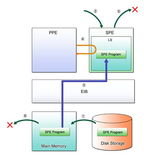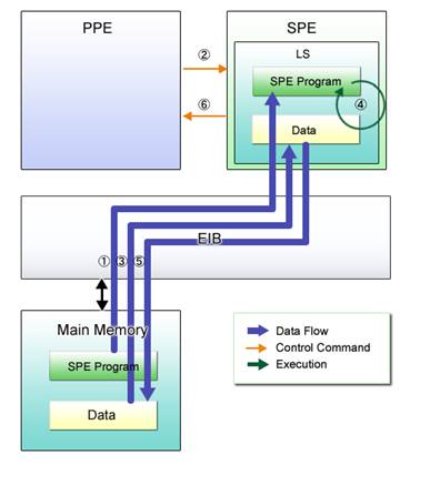 The execution procedure starts by loading the SPE program from the main memory to the LS. The SPE initiates program execution as soon as the execute command is received from the PPE program. Data necessary for computation is transferred from the main memory to the LS and upon completion of processing, the processed result is returned to the main memory. Then the SPE program terminates and relays this information back to the PPE program so that the PPE program can further process the SPE-processed data.